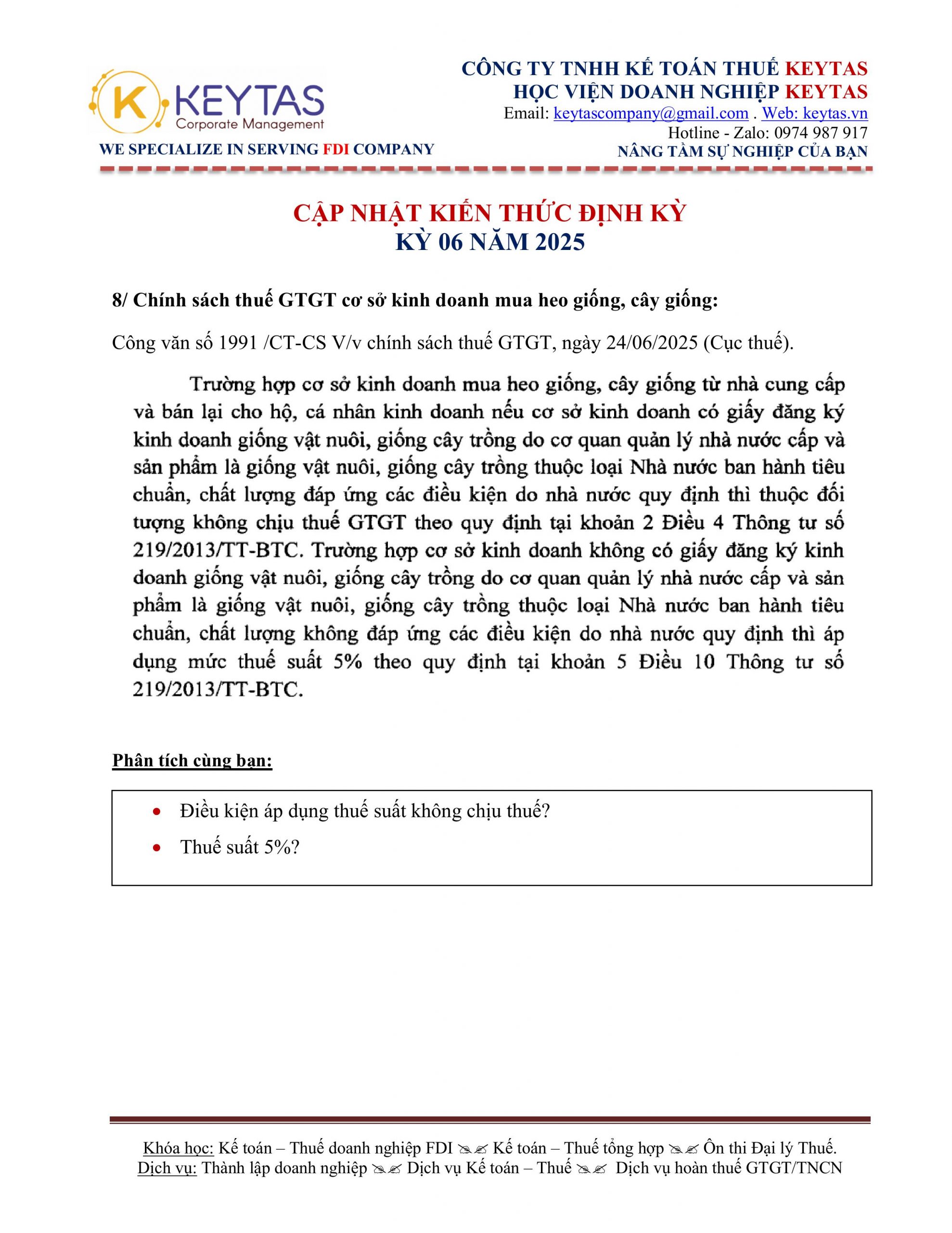 Trường hợp cơ sở kinh doanh mua heo giống, cây giống từ nhà cung cấp và bán lại cho hộ, cá nhân kinh doanh nếu cơ sở kinh doanh có giấy đăng ký kinh doanh giống vật nuôi, giống cây trồng do cơ quan quản lý nhà nước cấp và sản phẩm là giống vật nuôi, giống cây trồng thuộc loại Nhà nước ban hành tiêu chuẩn, chất lượng đáp ứng các điều kiện do nhà nước quy định thì thuộc đối tượng không chịu thuế GTGT theo quy định tại khoản 2 Điều 4 Thông tư số 219/2013/TT-BTC.